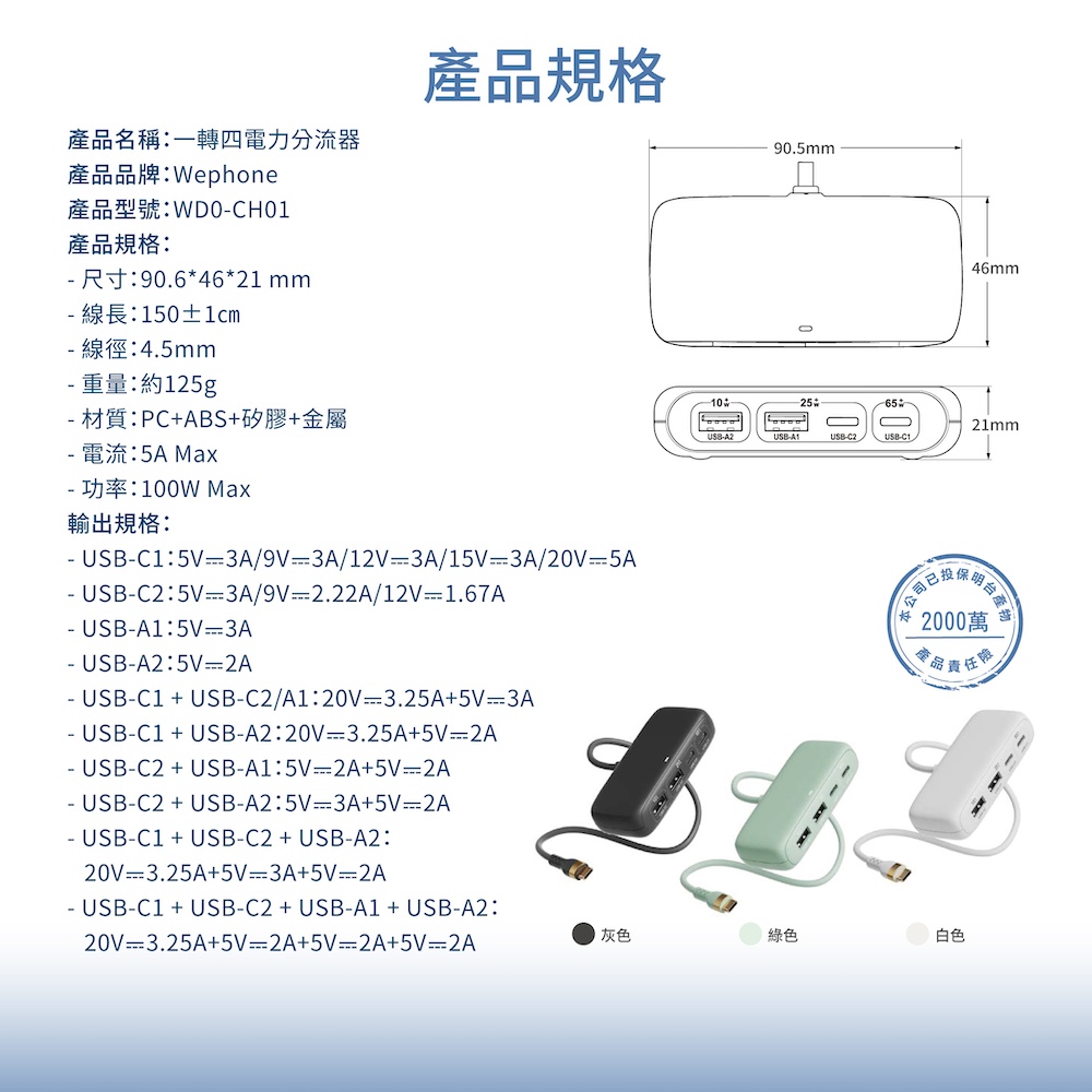 【Wephone】100W一轉四電力分流器 | E-Marker晶片 四孔輸出USB-A USB-C 1.5M 黑綠白